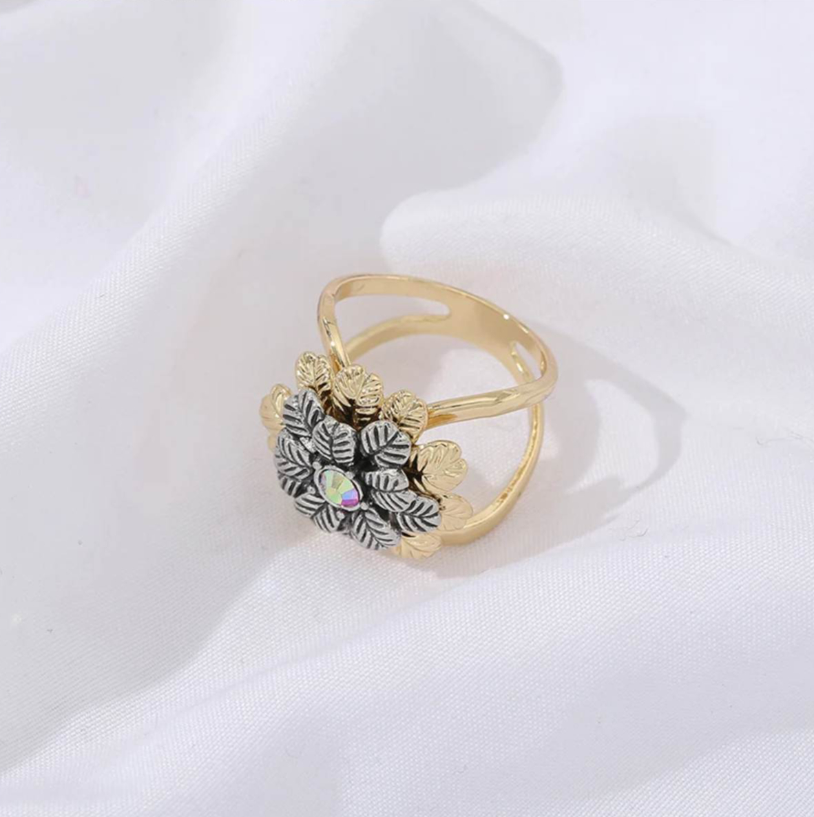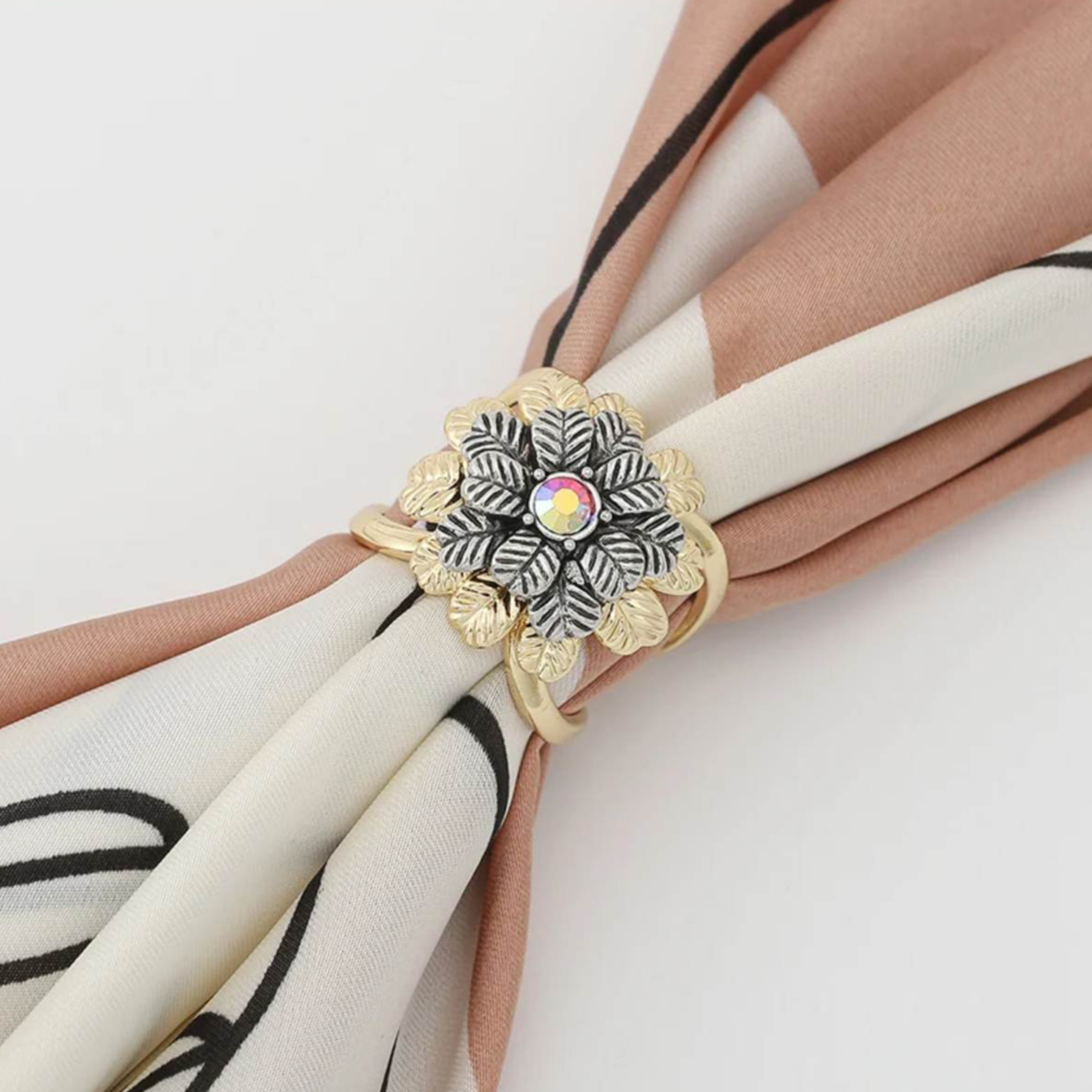 Brošňa na šatku a šál – zlatá a strieborná kvetina s farebným kryštálom