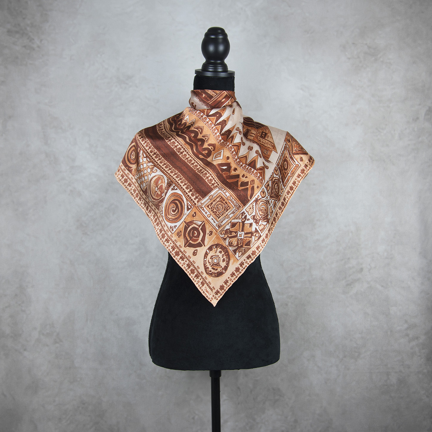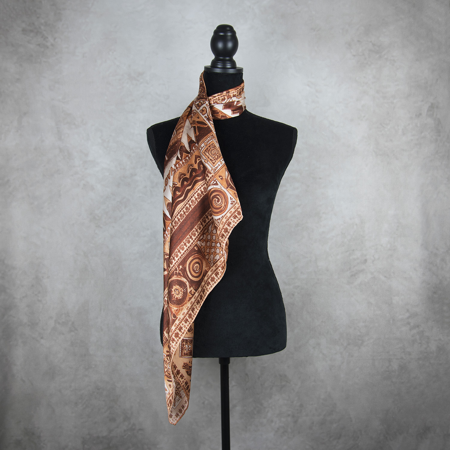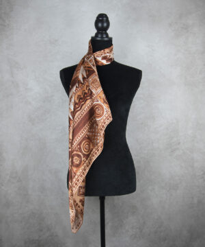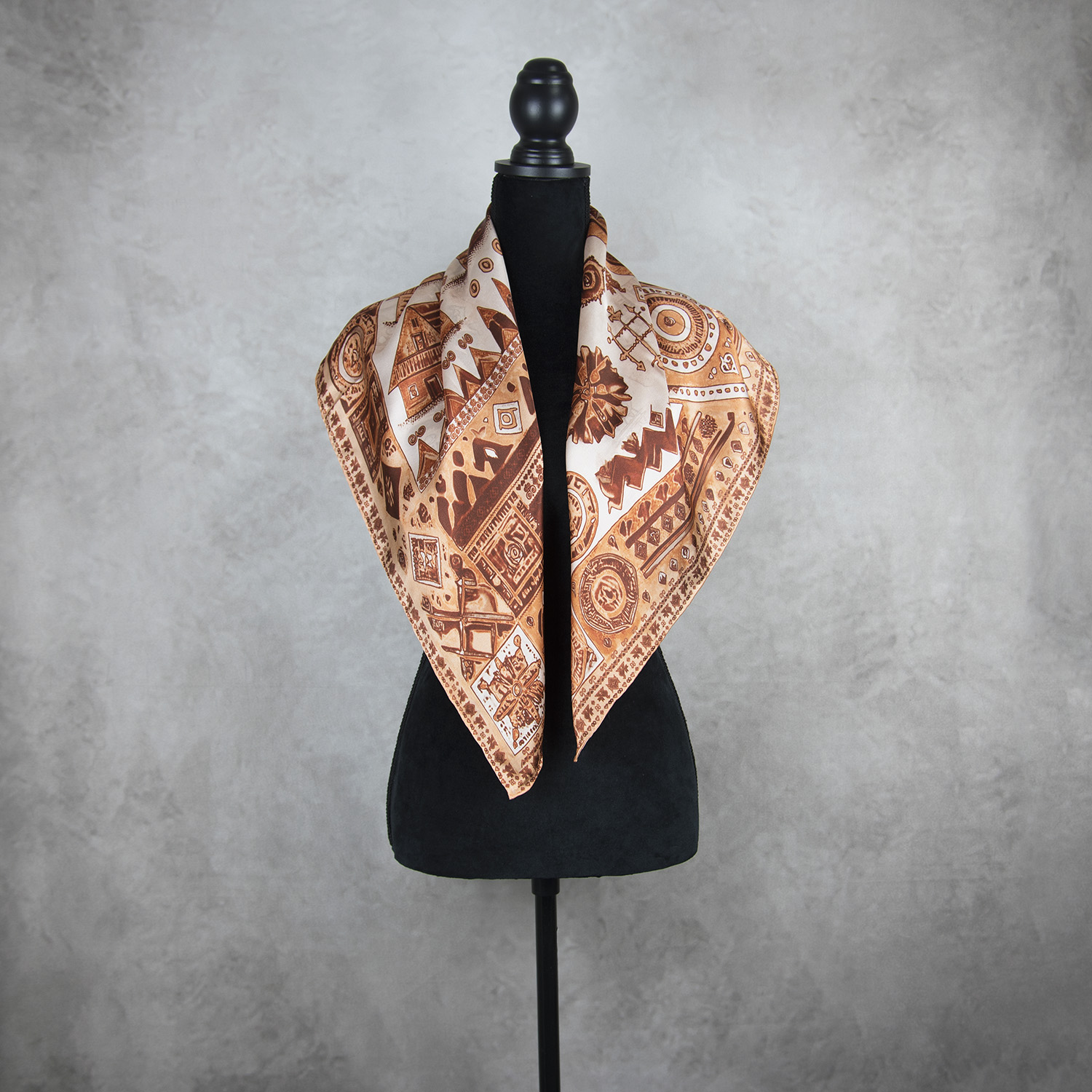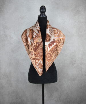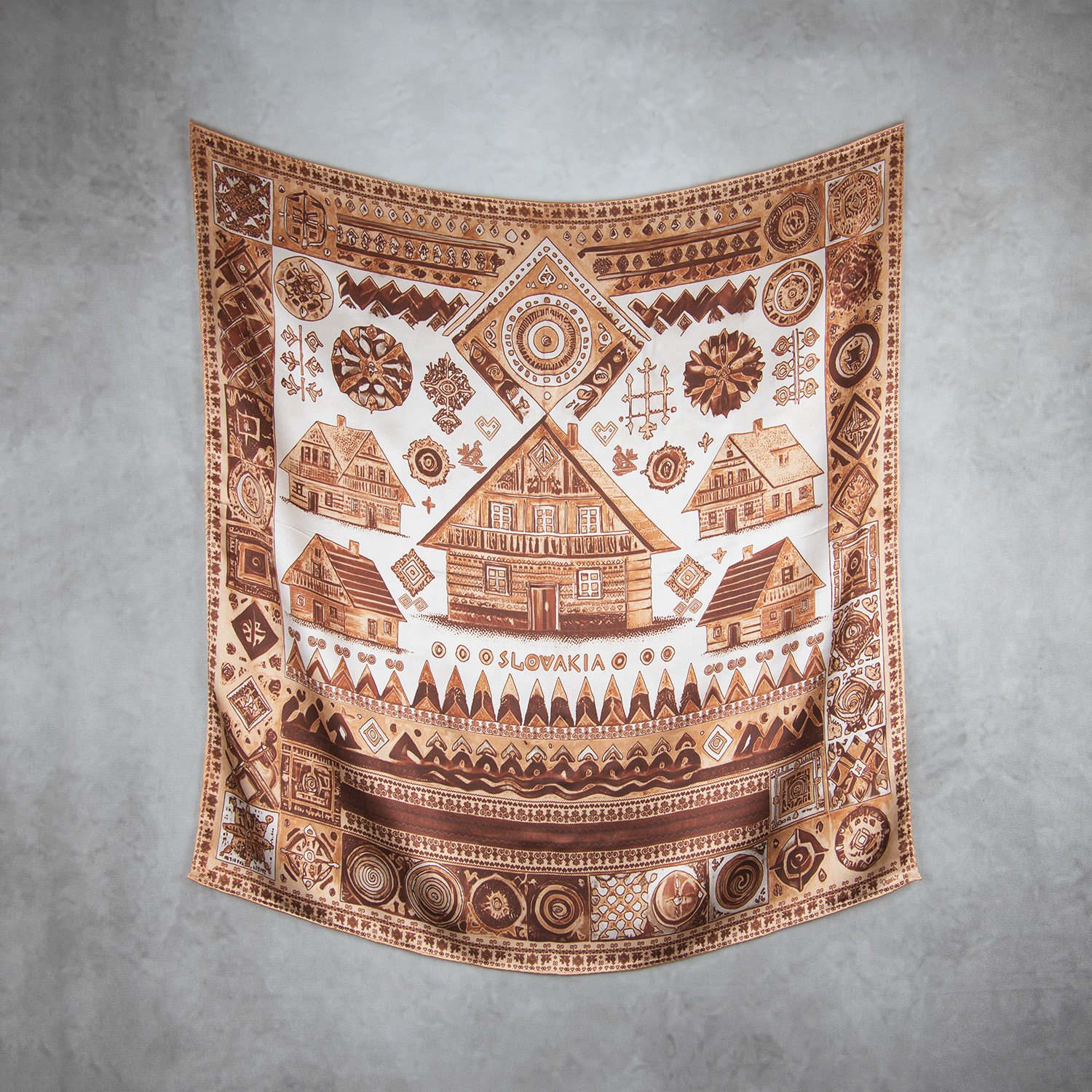 Hodvábna šatka ČIČMANY – SÉPIA, 90 x 90cm, Vyrobené na Slovensku
