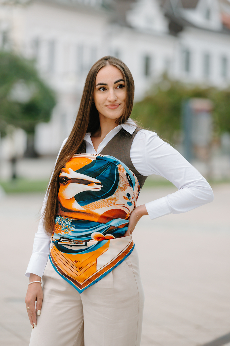 -klasická šatka okolo krku – vďaka vlastnostiam hodvábu je vhodné nosenie celoročne