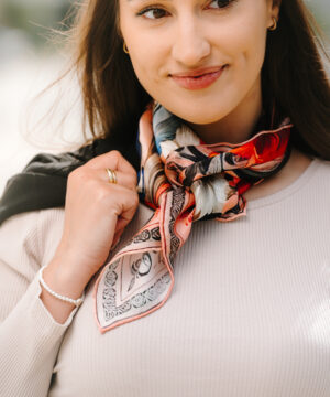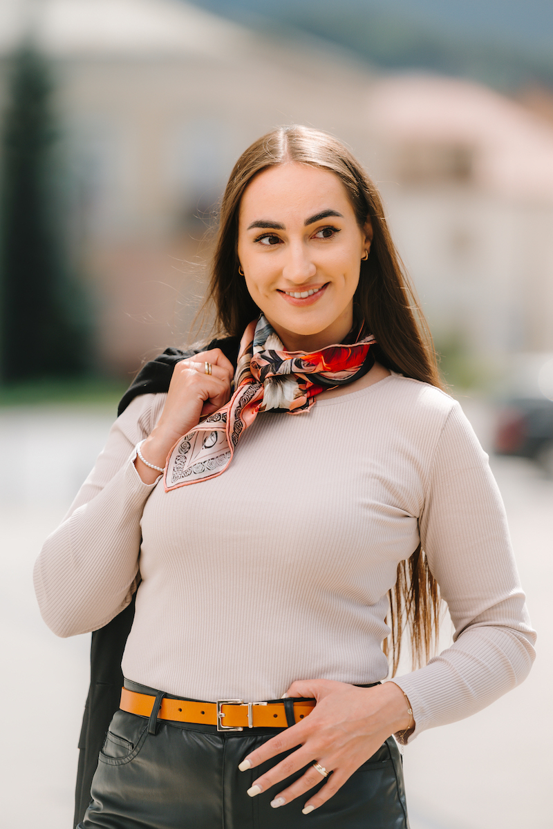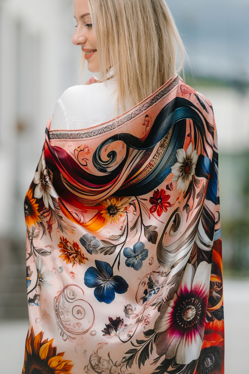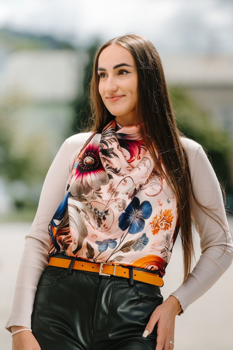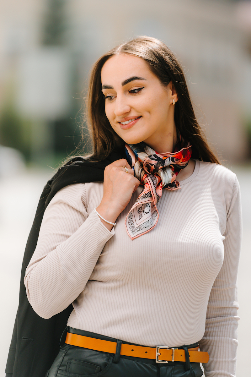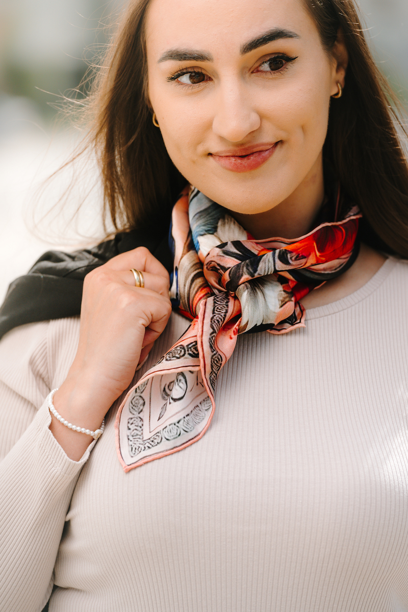 -klasická šatka okolo krku – vďaka vlastnostiam hodvábu je vhodné nosenie celoročne