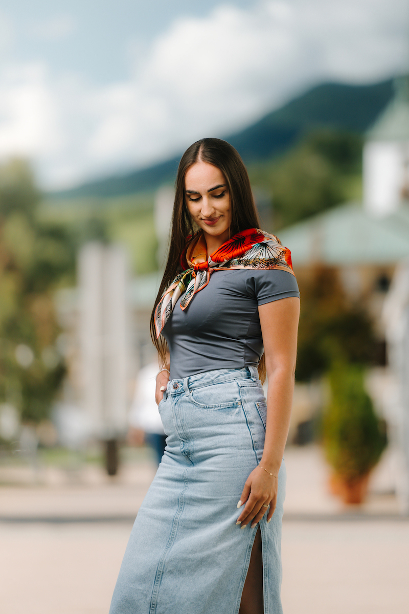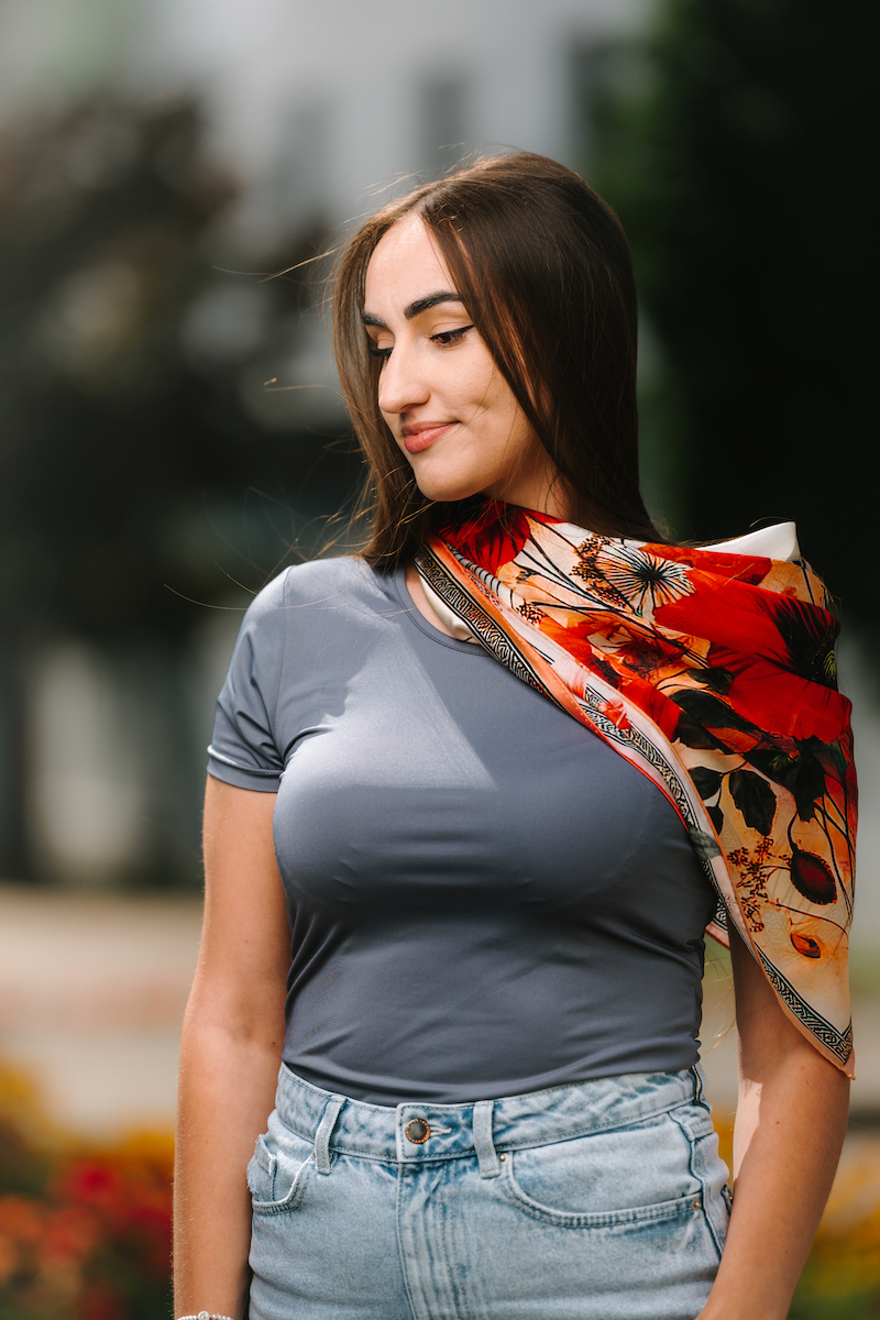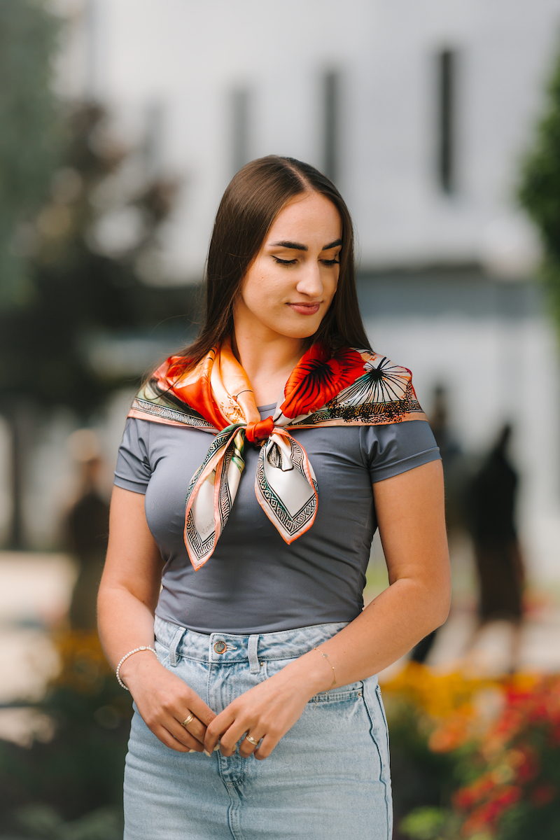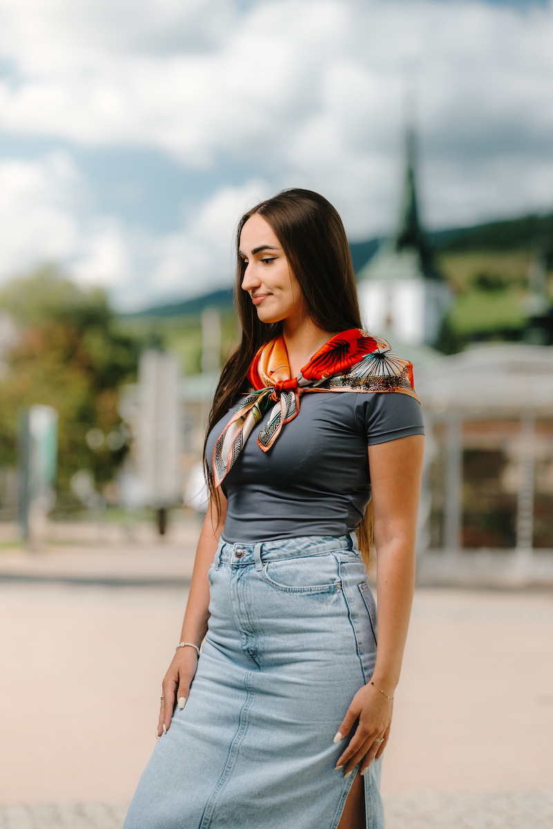 -klasická šatka okolo krku – vďaka vlastnostiam hodvábu je vhodné nosenie celoročne