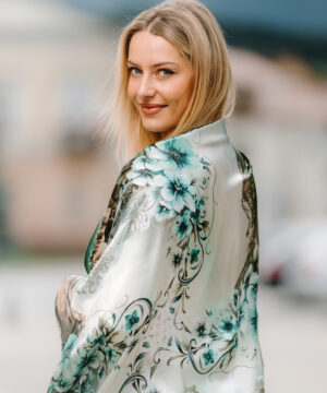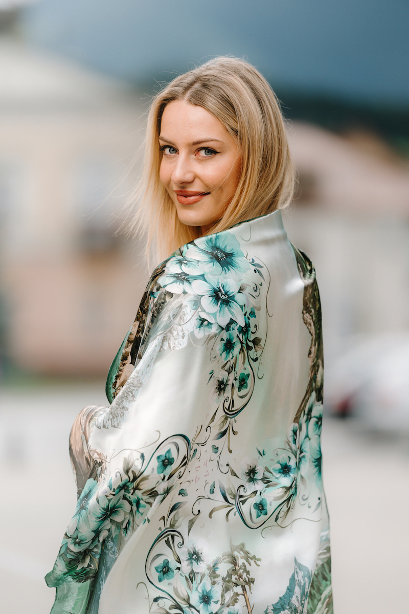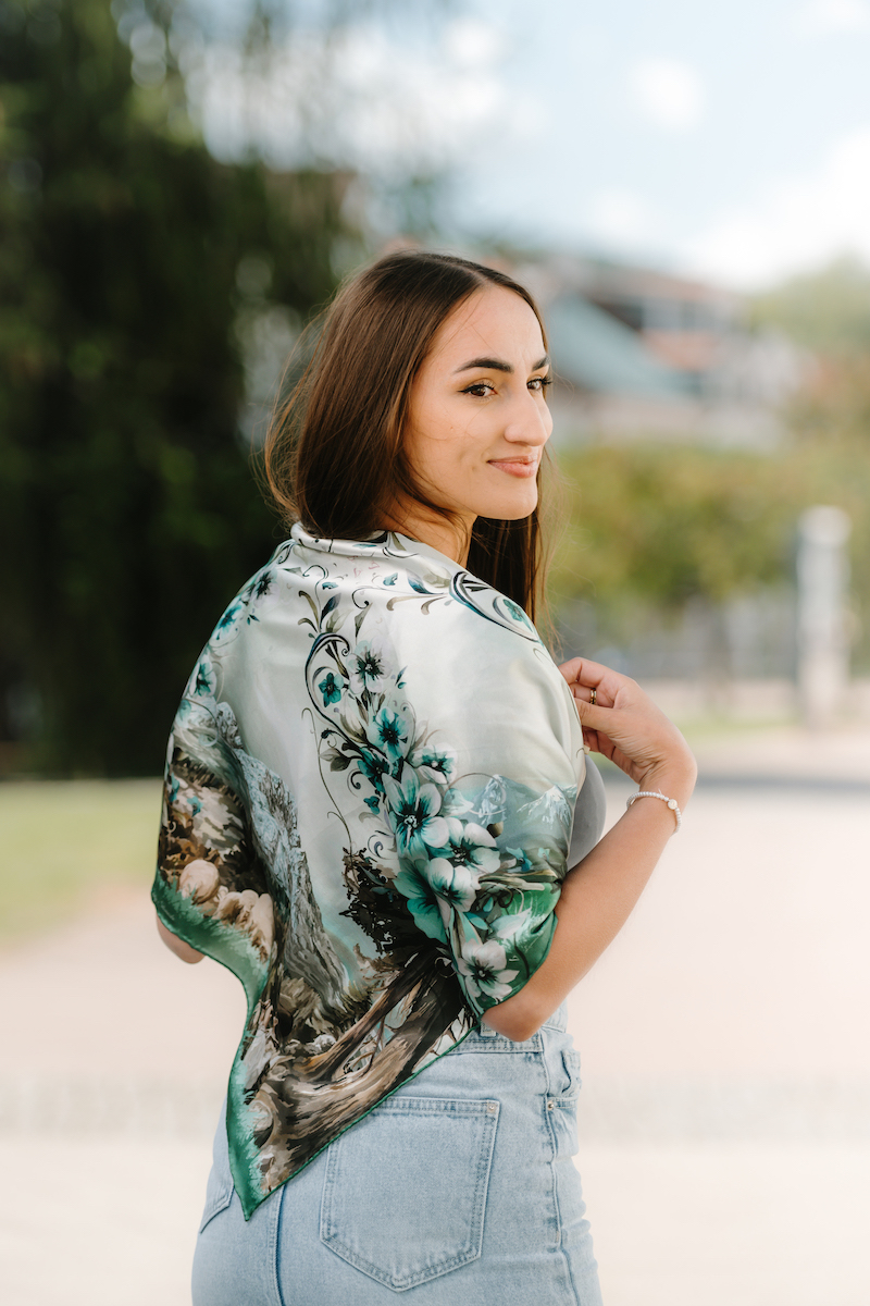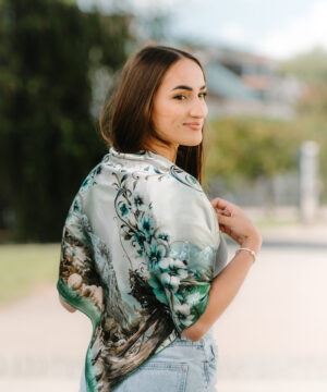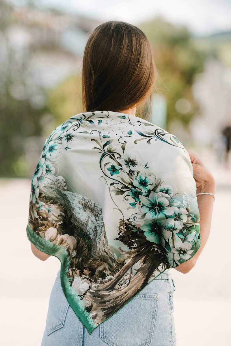 -klasická šatka okolo krku – vďaka vlastnostiam hodvábu je vhodné nosenie celoročne