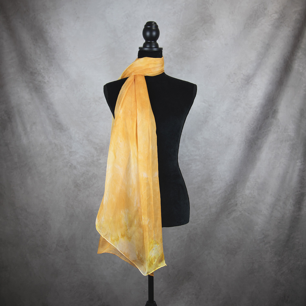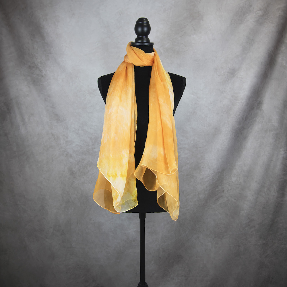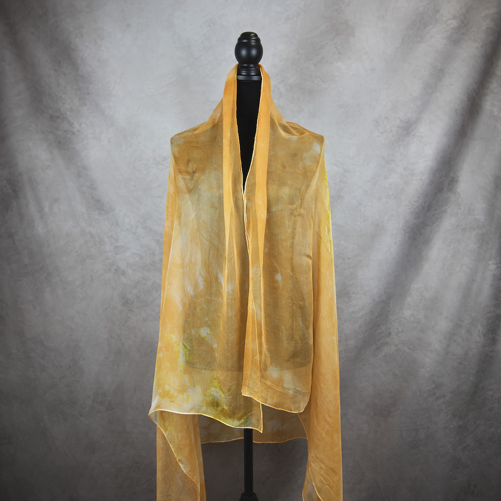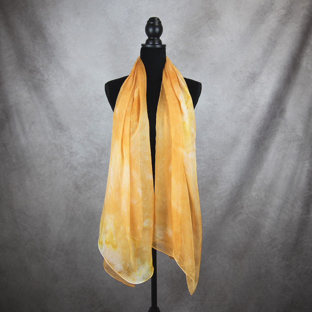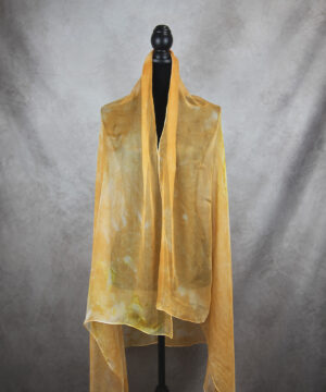 Postup tvorby: Šál je farbený špeciálnym spôsobom, 100% prírodným pigmentom určeným priamo na farbenie hodvábu. Farba je zafixovaná, šál vypratý a ošetrená fixátorom farieb. Okraje sú ručne zrolované a ručne prešité a následne je celý šál vyžehlený.