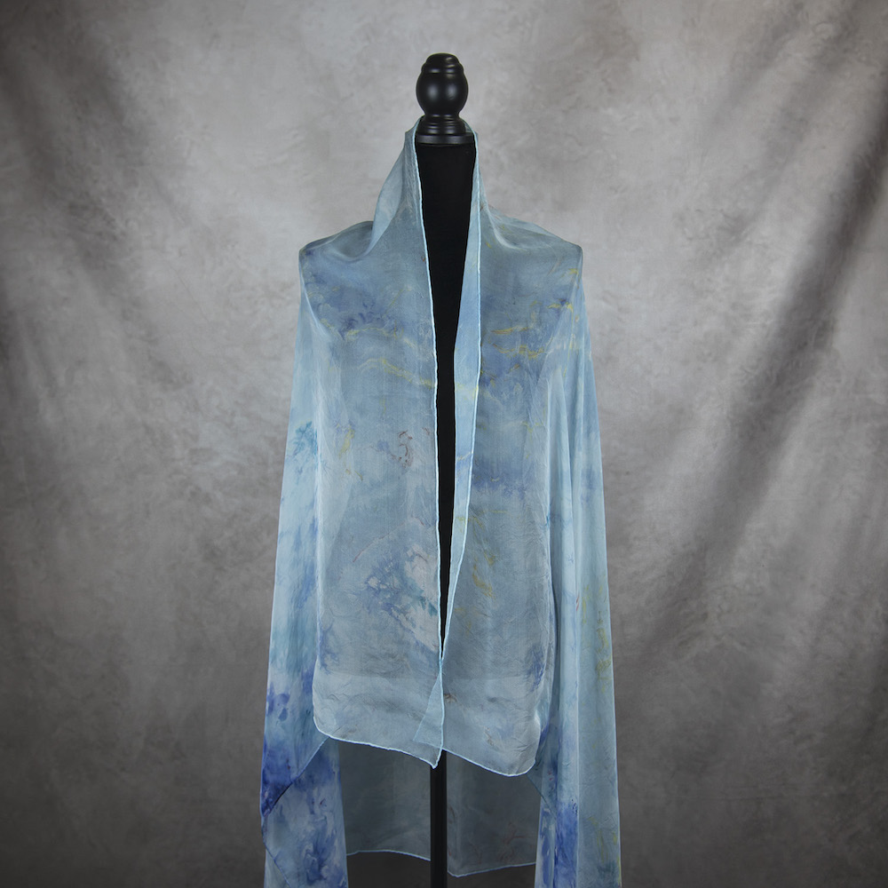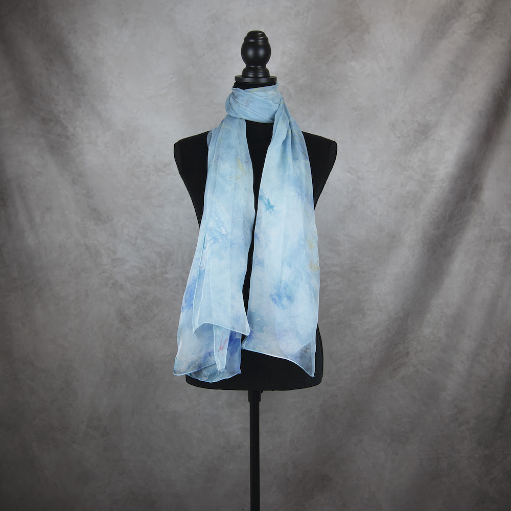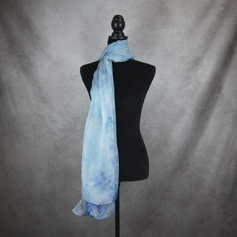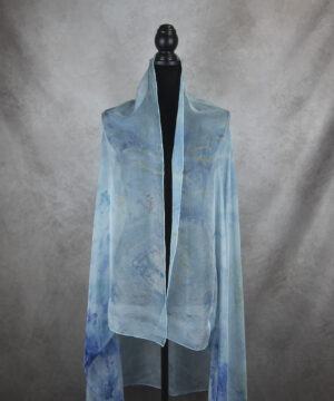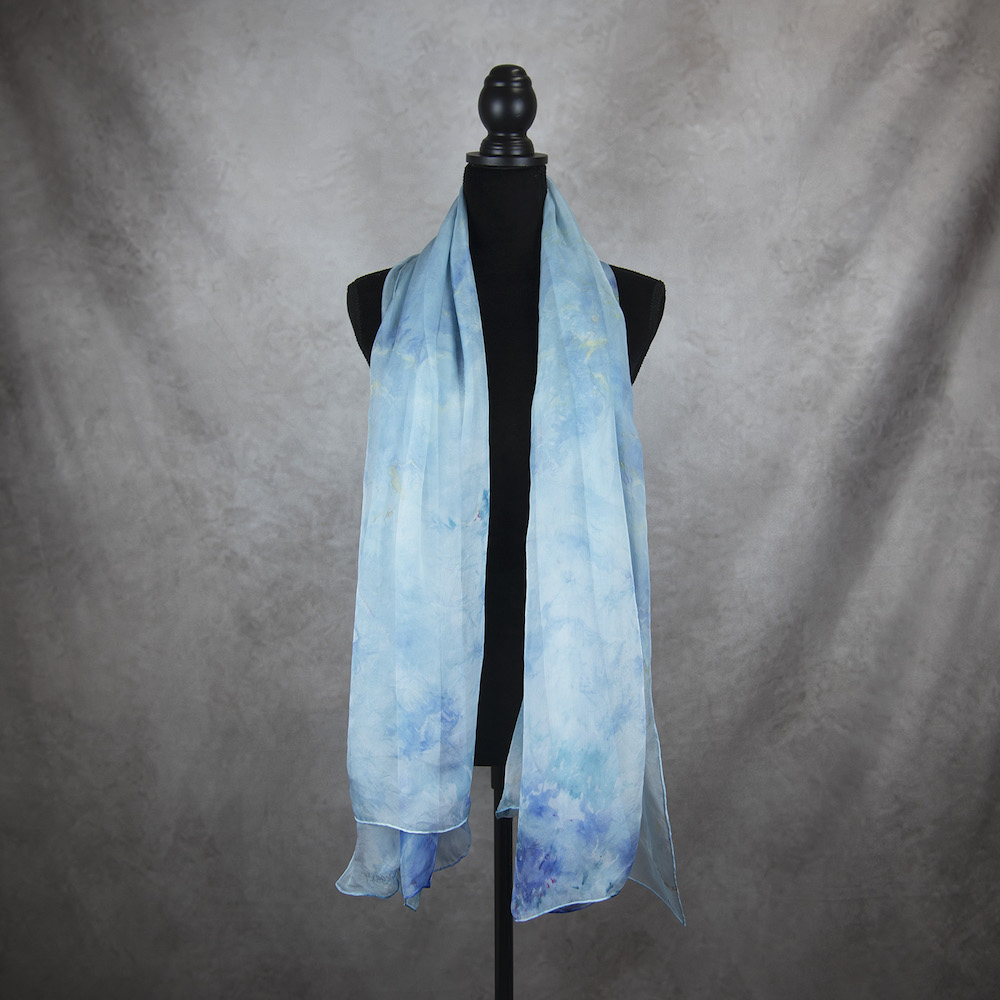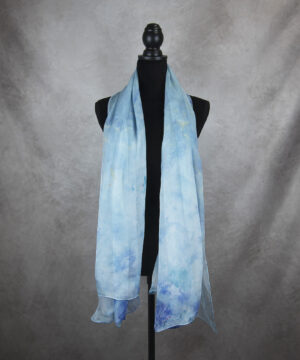 Postup tvorby: Šál je farbený špeciálnym spôsobom, 100% prírodným pigmentom určeným priamo na farbenie hodvábu. Farba je zafixovaná, šál vypratý a ošetrená fixátorom farieb. Okraje sú ručne zrolované a ručne prešité a následne je celý šál vyžehlený.