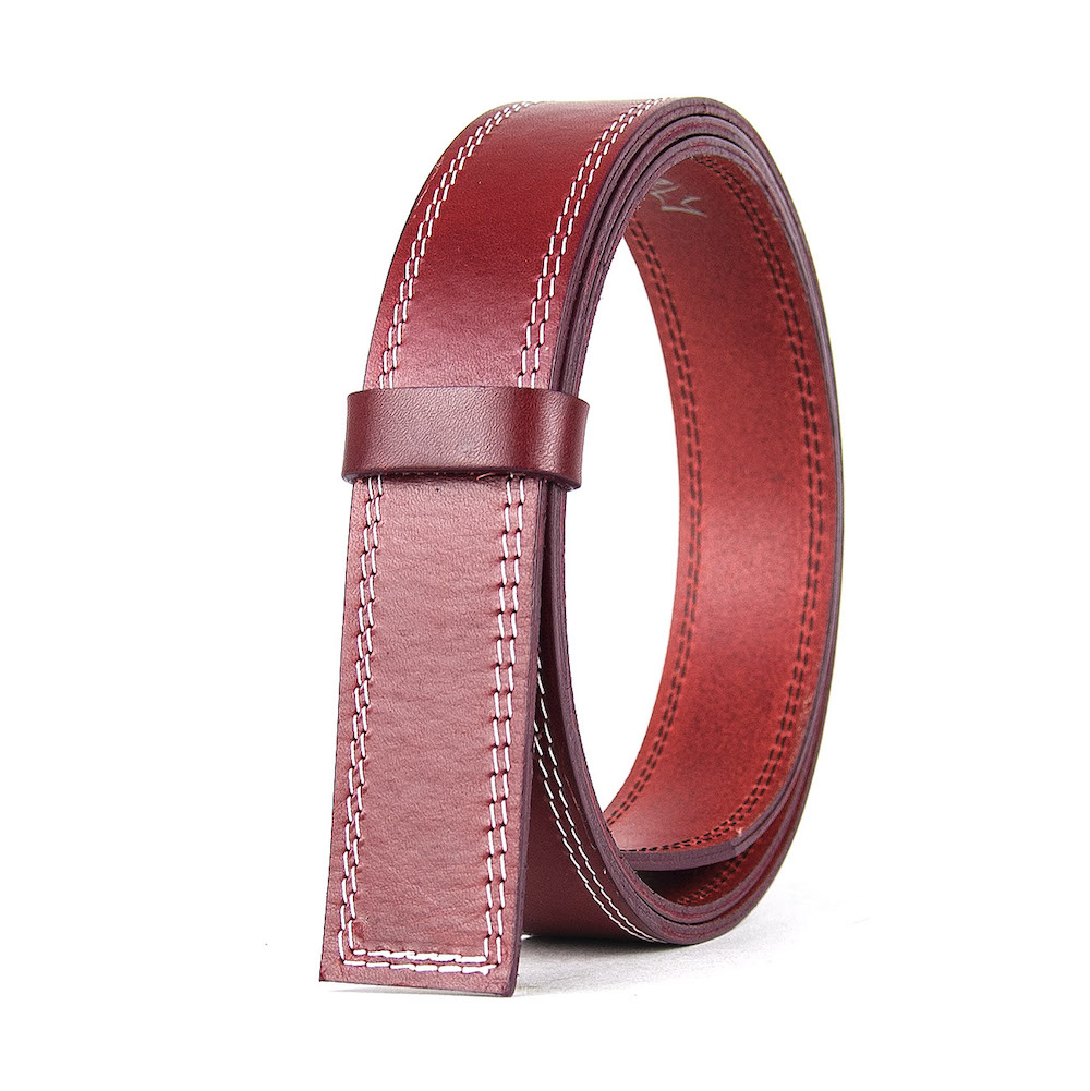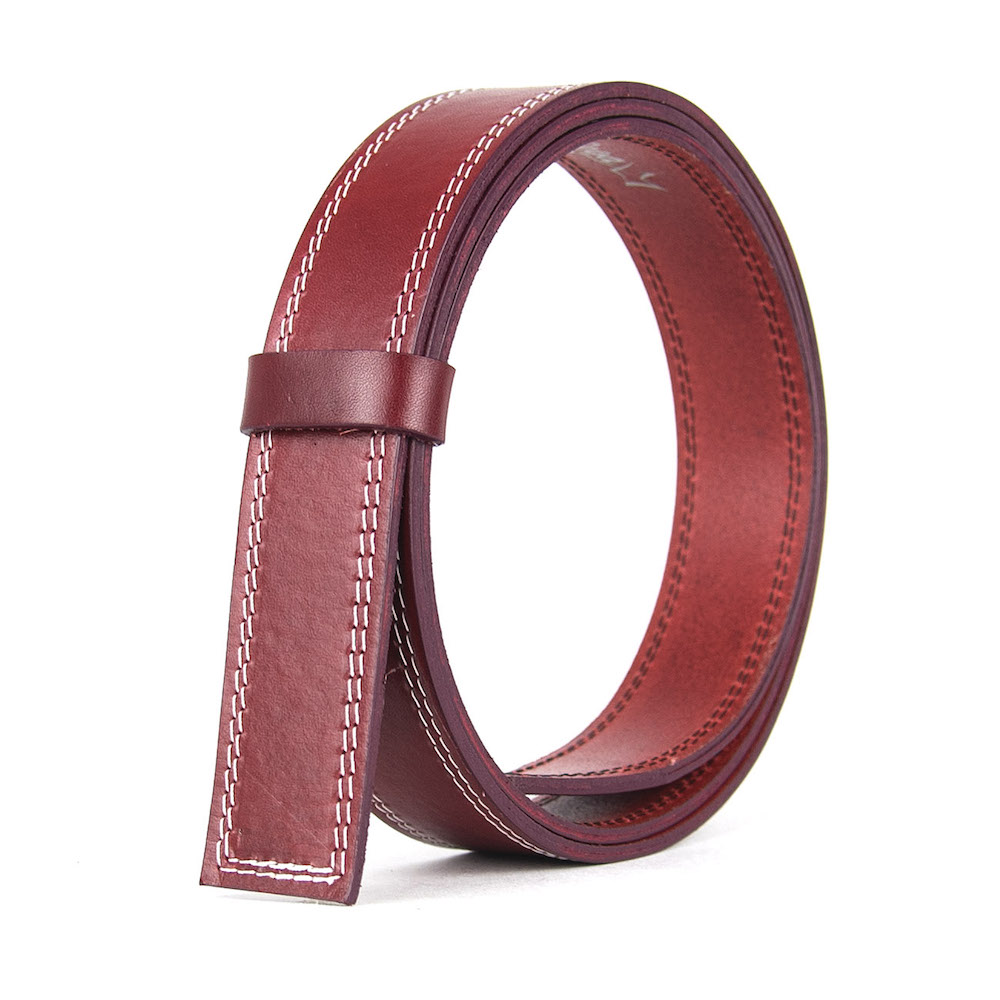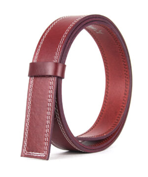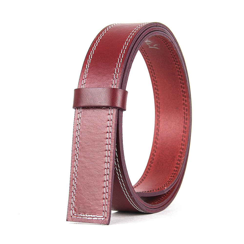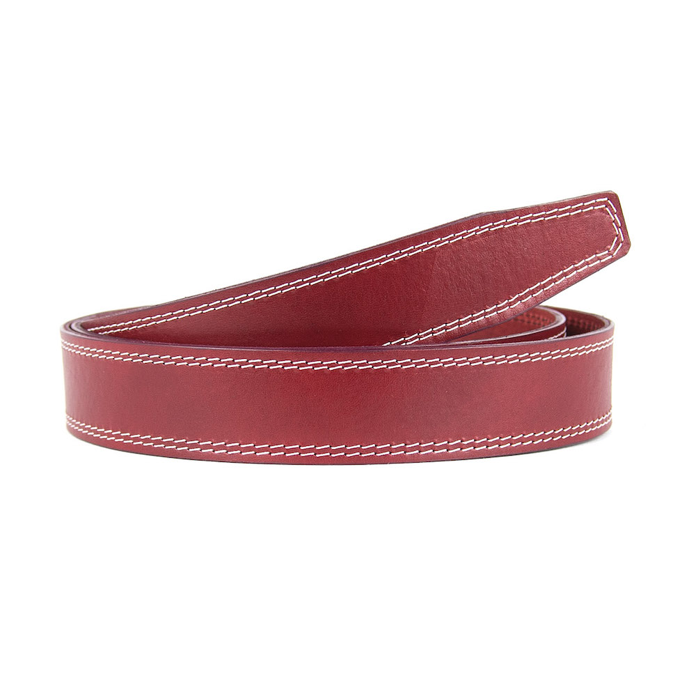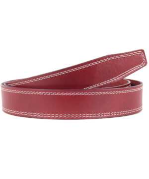 Kožený remeň pre opasky s prackou na brzdu, šírka 3.5cm, bordová farba s bielym dvojitým prešívaním